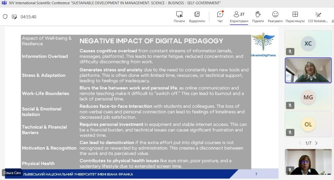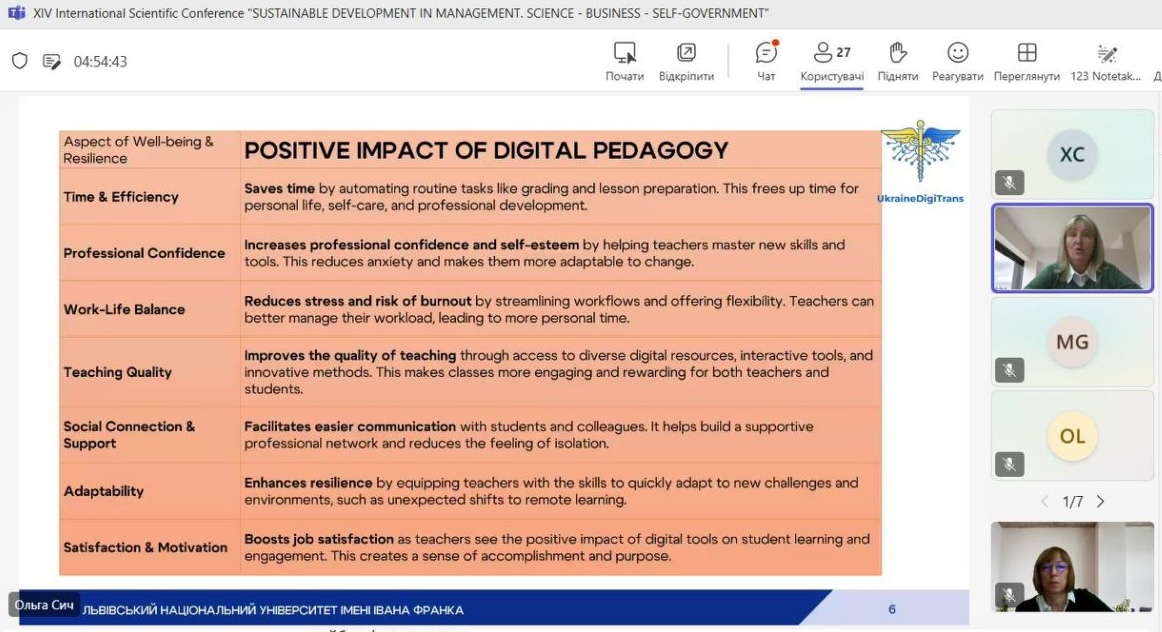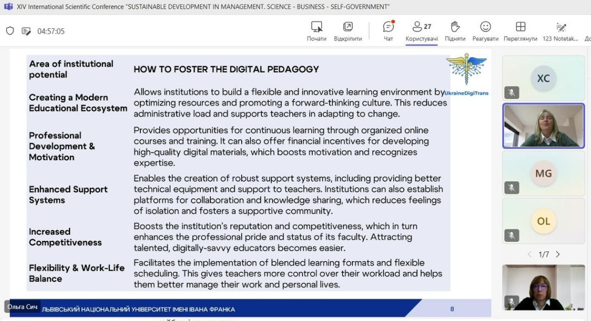 В межах другої секції доповідь виголосила учасниця команди проекту UkraineDigiTrans від ЛНУ імені І. Франка Ольга Сич на тему «Підвищення цифрових навичок та стійкості викладачів у вищих навчальних закладах». В презентації було окреслено поняття цифрових навичок та цифрової стійкості, представлено переваги та вузькі місця впровадження цифрових інструментів у освітній процес. На завершення було запропоновано кроки на інституційному рівні для підвищення резильєнтності викладача в цифрову епоху. Доповідь викликали зацікавленість учасників конференції та обговорення можливості подальших спільних досліджень щодо впровадження ШІ в освітній процес.